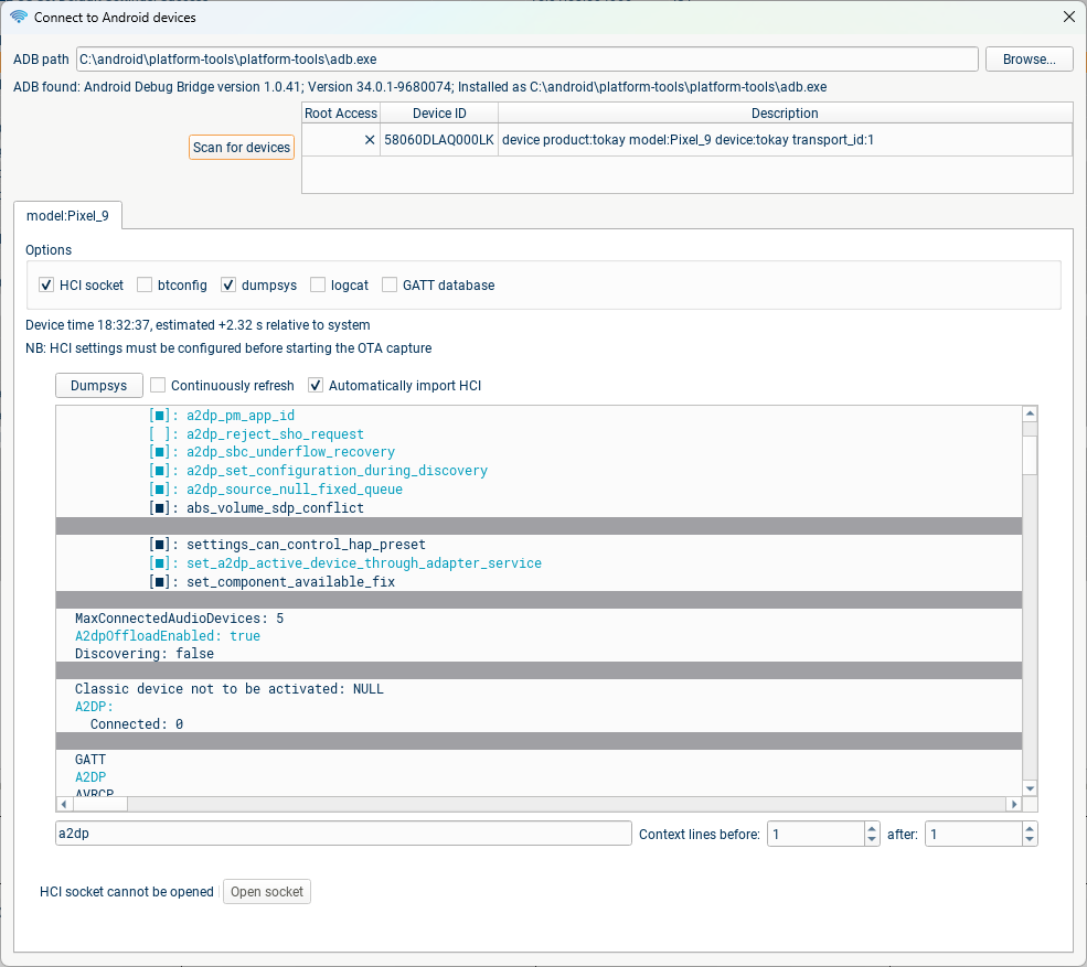 This doesn't require root; you can continuously run this command to update the dumpsys, and you can use the textbox at the bottom to filter for particular strings. On some devices, a base64-encoded dump of recent HCI messages appears as part of this log; if this dump is present, then blueSPY can import the HCI live into an ongoing capture.