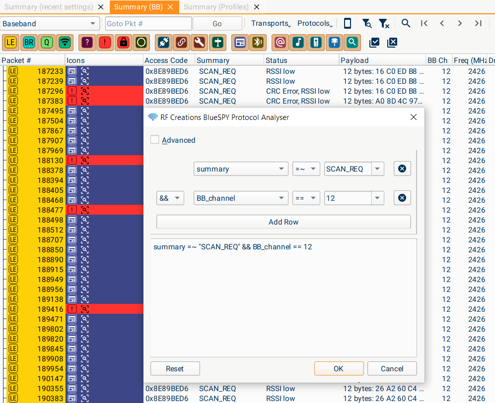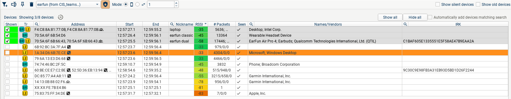 The second filtering tool allows LE and BR/EDR devices to be hidden or displayed. It is possible to create multiple device filters, which can be used independently in different tabs; so for instance you can create a "Broadcasters" filter to display in one Summary tab, and a "Phone and earbuds" filter to display in a second Summary tab.