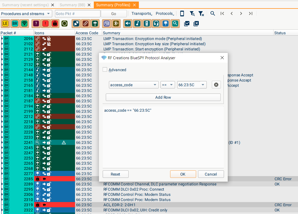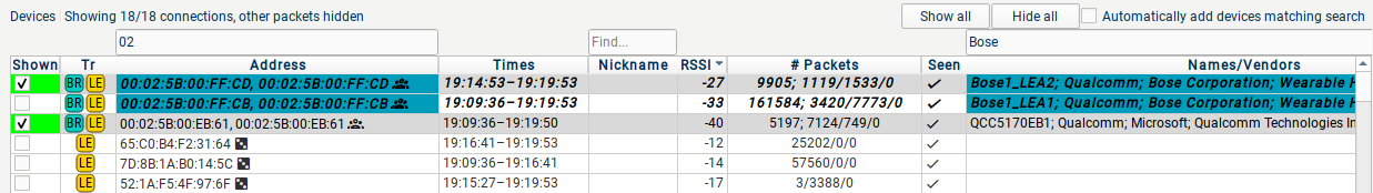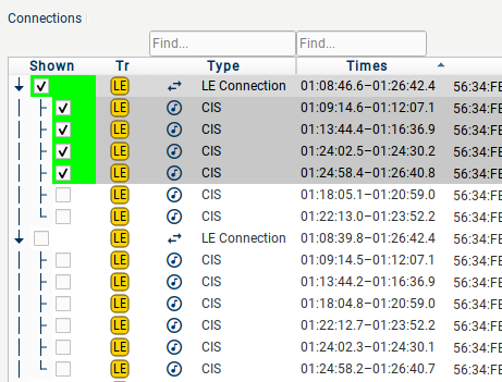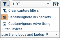 In Devices mode, the filter displays all packets involving a selected device, and all packets on any connection involving the device. In Connections mode, you can filter these packets further; the connections and audio streams involving the selected devices are shown in the lower pane of the tab, and you can choose which connections, and which streams (CIS, A2DP etc) on a connection to show.
