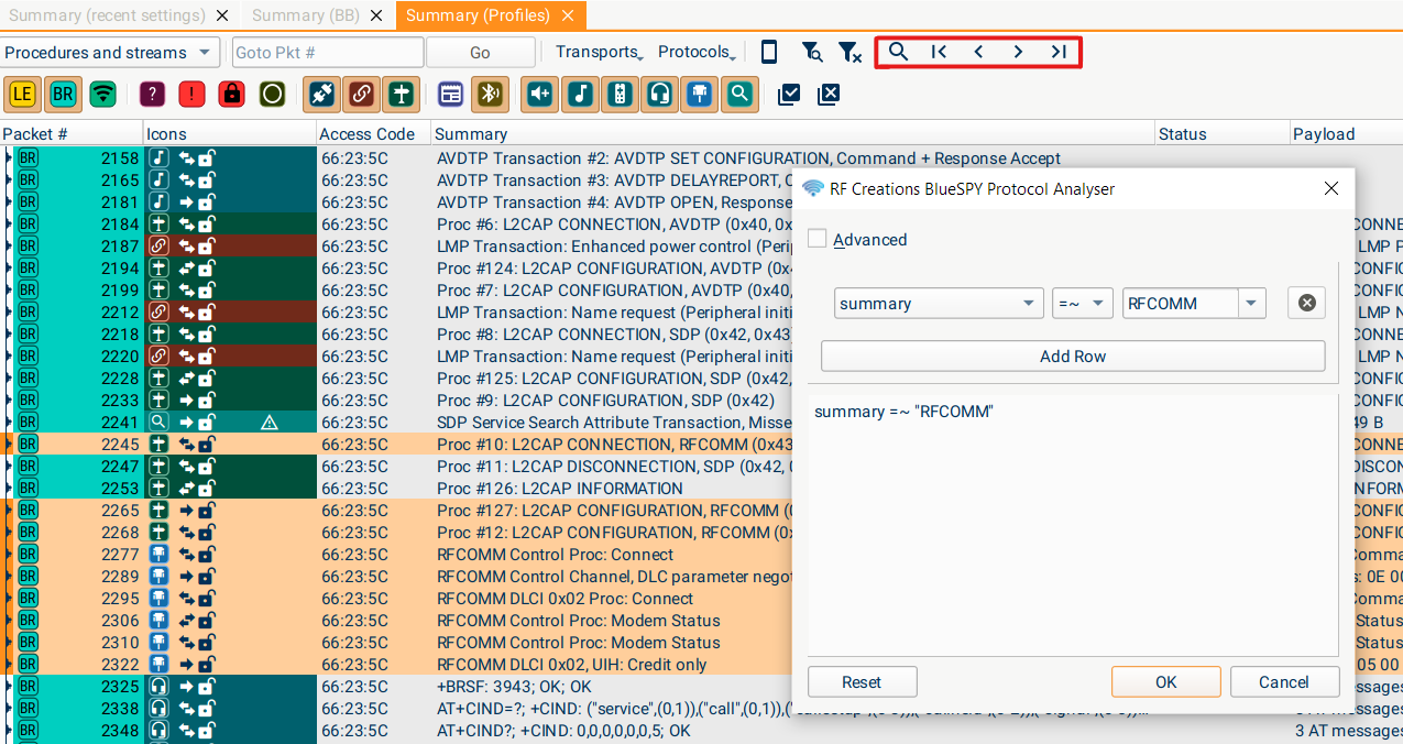 A similar interface can also be used to select packets matching a given search; the arrows to the right of the Search icon can then be used to step between the selected events.