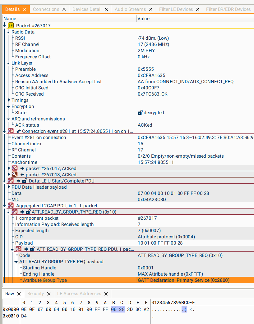 Any highlighted fields in a payload shown in the Details tab correspond to bits or bytes within the Raw data. In the screenshot above, the "Attribute Group Type" field has been selected, and so the corresponding bytes 0x00, 0x28 in the Raw data have been highlighted.