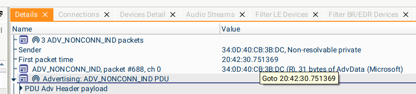 If you want to look at the contents of two or more packets at the same time, you can create multiple Details tabs; you can then click on a packet, pause/freeze the contents of one Details tab, and click on another packet to update the second Details tab. This can be useful to retain a configuration packet/procedure (e.g. an LL_CIS_IND, an ASE CP Config Codec, or a Channel Sounding Start procedure) while looking at the details of individual packets.