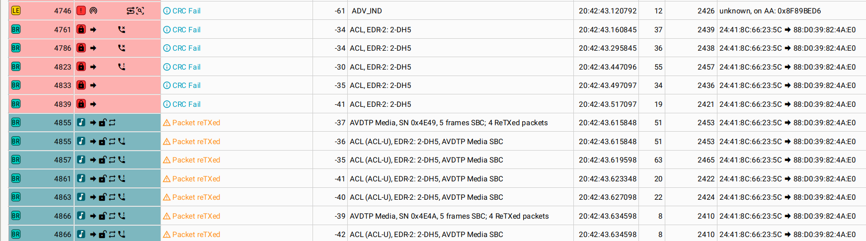 This collects together errors/warnings/informative messages seen during the capture, and allows filtering and sorting them to easily display all the instances of a particular type of issue. The issues displayed include both Bluetooth errors (invalid values, packets with invalid lengths etc), communication impairments (ReTXed packets, rejected packets), receive impairments (CRC fails, MIC fails, missing packets), and analyser difficulties (e.g. protocols not parsed, either due to use of proprietary protocols or features not yet supported).