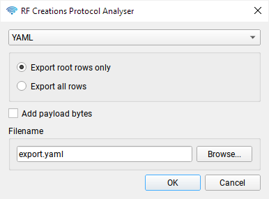 Additionally, the complete contents of a Summary tab can be exported as either a CSV or YAML file using the "Export..." option in the context menu. When using an aggregation level other than "Baseband", you have the option to export only the top-level, root rows. You can also choose to add the complete payload bytes (dewhitened, decrypted etc) to the export.
