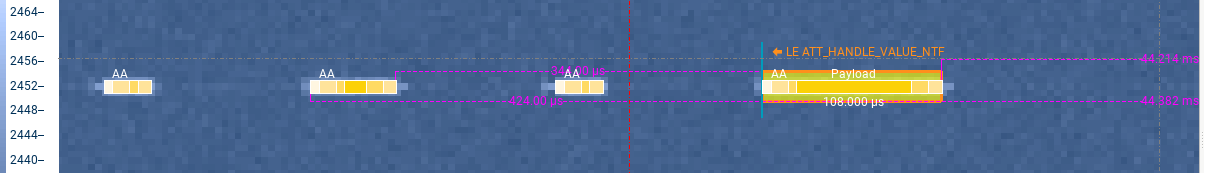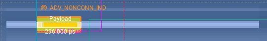 The shorter rectangles in solid colours represent on-air packets. The larger translucent rectangles represent groupings of those packets (LE Advertising Events and Connection Events, BR/EDR Slot Pairs, CIS/BIS events). The selected packet or packets are highlighted with a yellow box; as in the Spectrum tab, clicking on a packet will cause it to be selected in the other tabs unless it has been hidden there.