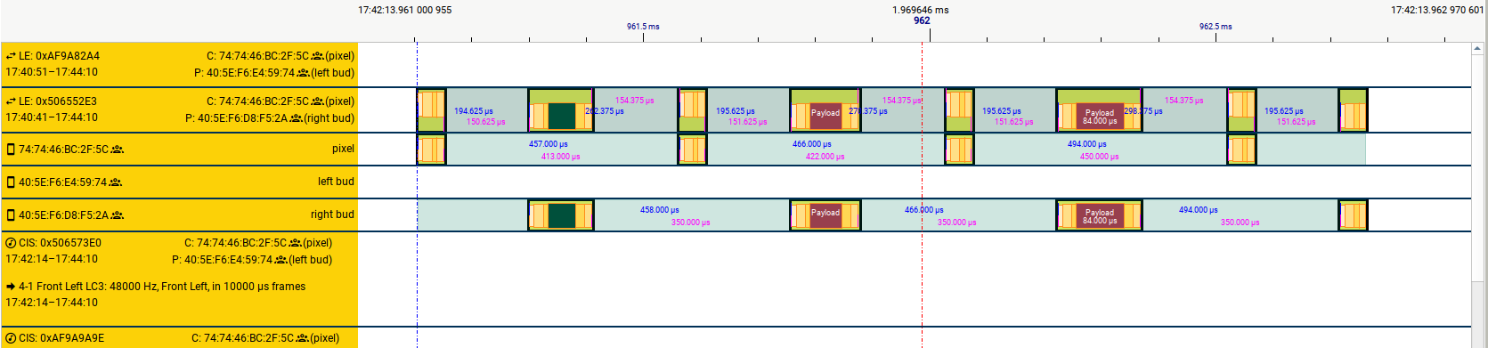 Use the "Connections" mode in the device filter and deselect some of the connections or audio streams. This is helpful when your DUT has various connections to uninteresting 3rd devices and you are only interested in e.g. the phone <-> earbud connections.