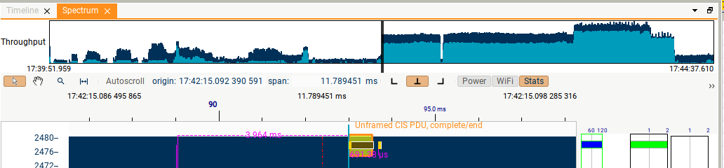 The Spectrum and Timeline tabs have much in common, and take two different approaches to a common goal: Displaying received packets sequentially in time.