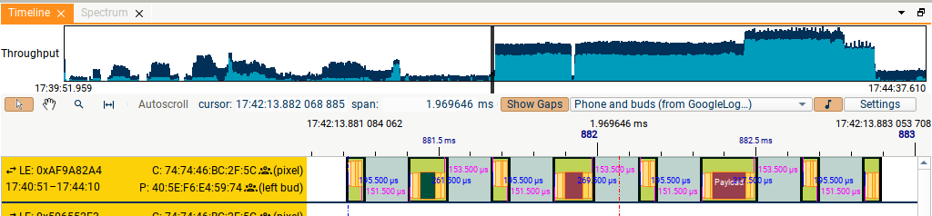 In both tabs, time gaps to earlier/later packets and events are shown. More detail is shown in the Spectrum tab than in the Timeline, but the gaps displayed in the Timeline (if "Show Gaps" is enabled) will always represent gaps between events from the same Device/Connection.