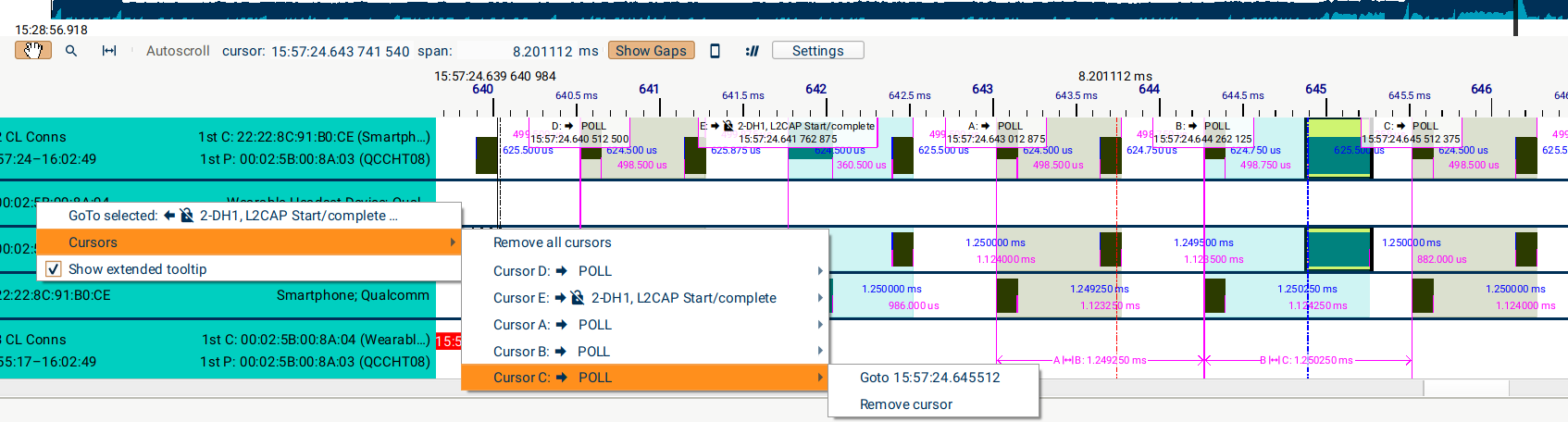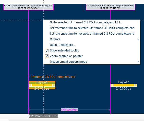 Measurement cursors: as you move your mouse, these can either snap to a packet edge only when close to a packet, or always snap to a packet/other event (e.g. logic line edges).