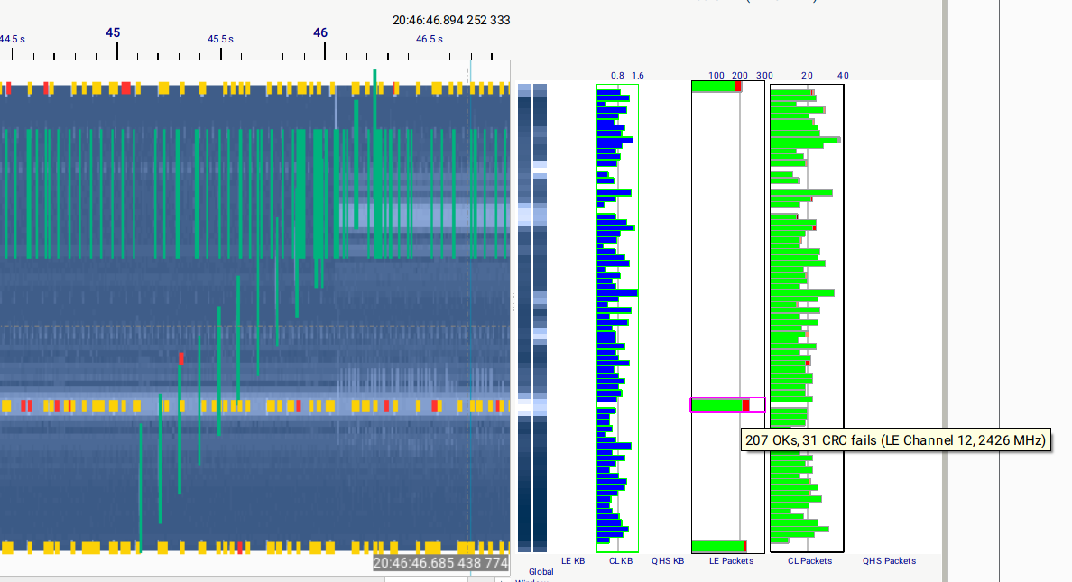 Per-channel statistics showing average power, throughput, and packet success (rates of ReTXes, CRC or dewhitening fails, and Rejections) can be enabled using the "Stats" button. To see details of the values represented by each bar in the bar chart, hover over the bar.