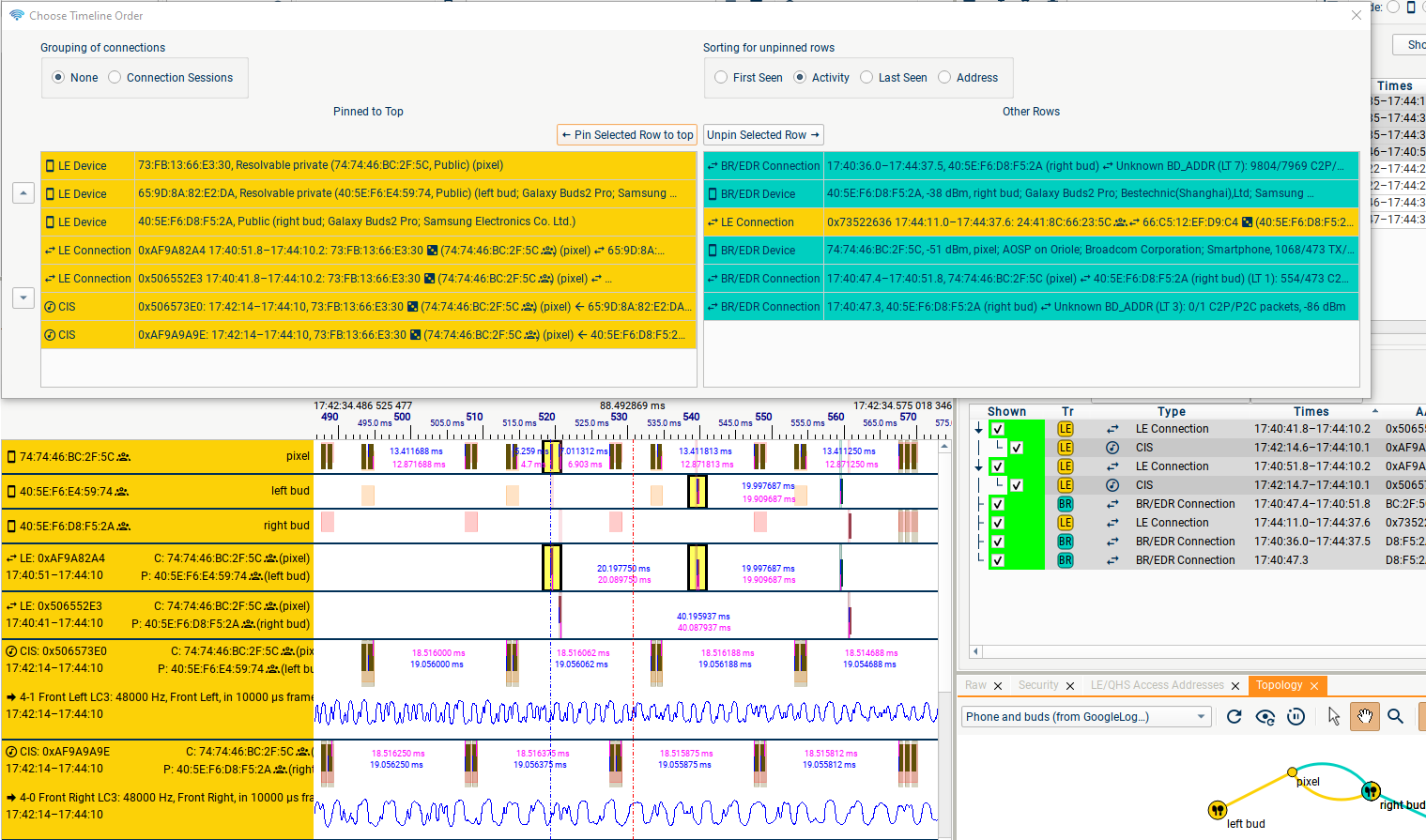 The rows shown in the Timeline are determined by the devices, connections, and audio streams you have enabled in the chosen device filter. If you find that the packets from your DUTs are separated out into too many rows and it's hard to see everything you need, there are two ways to reduce the number of rows: